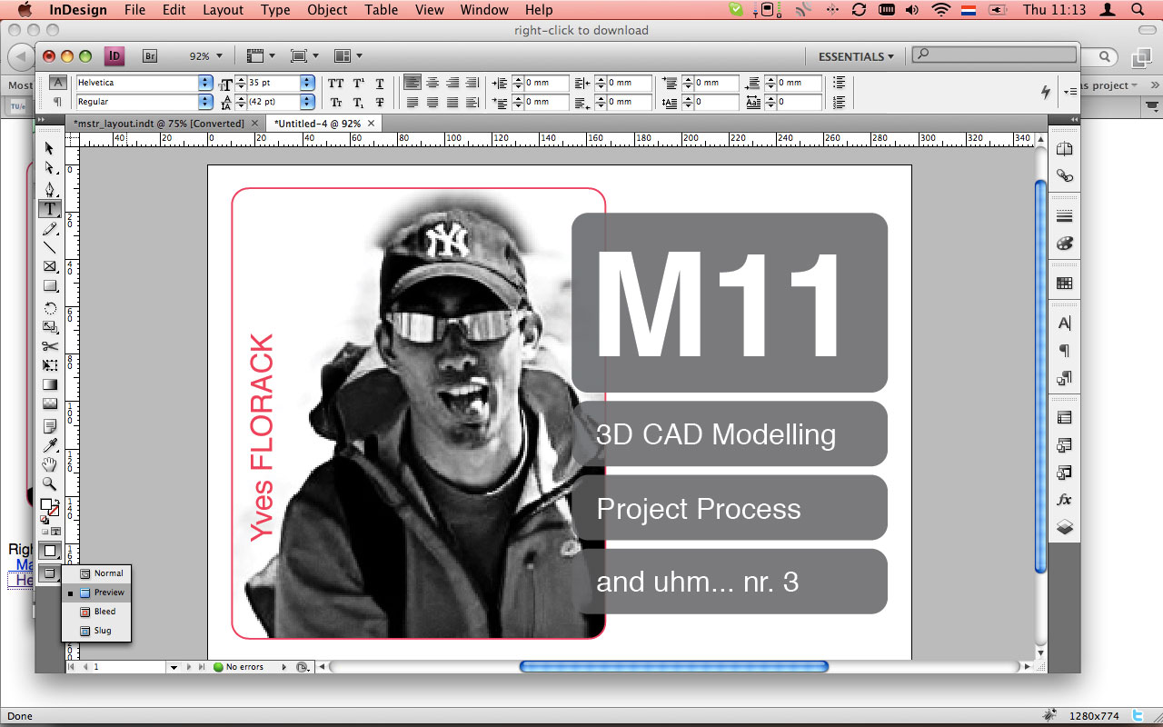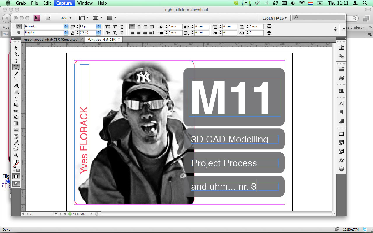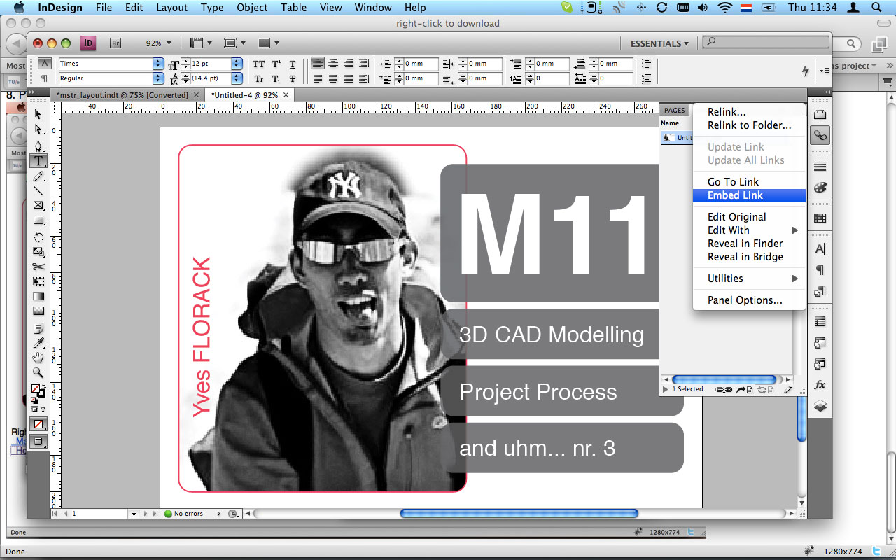 | 9. Adjust it until a satisfied sensation is felt. You may/can slightly play around with the vertical positioning of your name. 10. Embed your linked Photo; menu "Window" "Links", select and right-click picture-link in the Links window and "Embed Link". Save your Profile and name it as such: Semester_LASTNAME_Firstname.indd (eg: M11_FLORACK_Yves.indd ) |