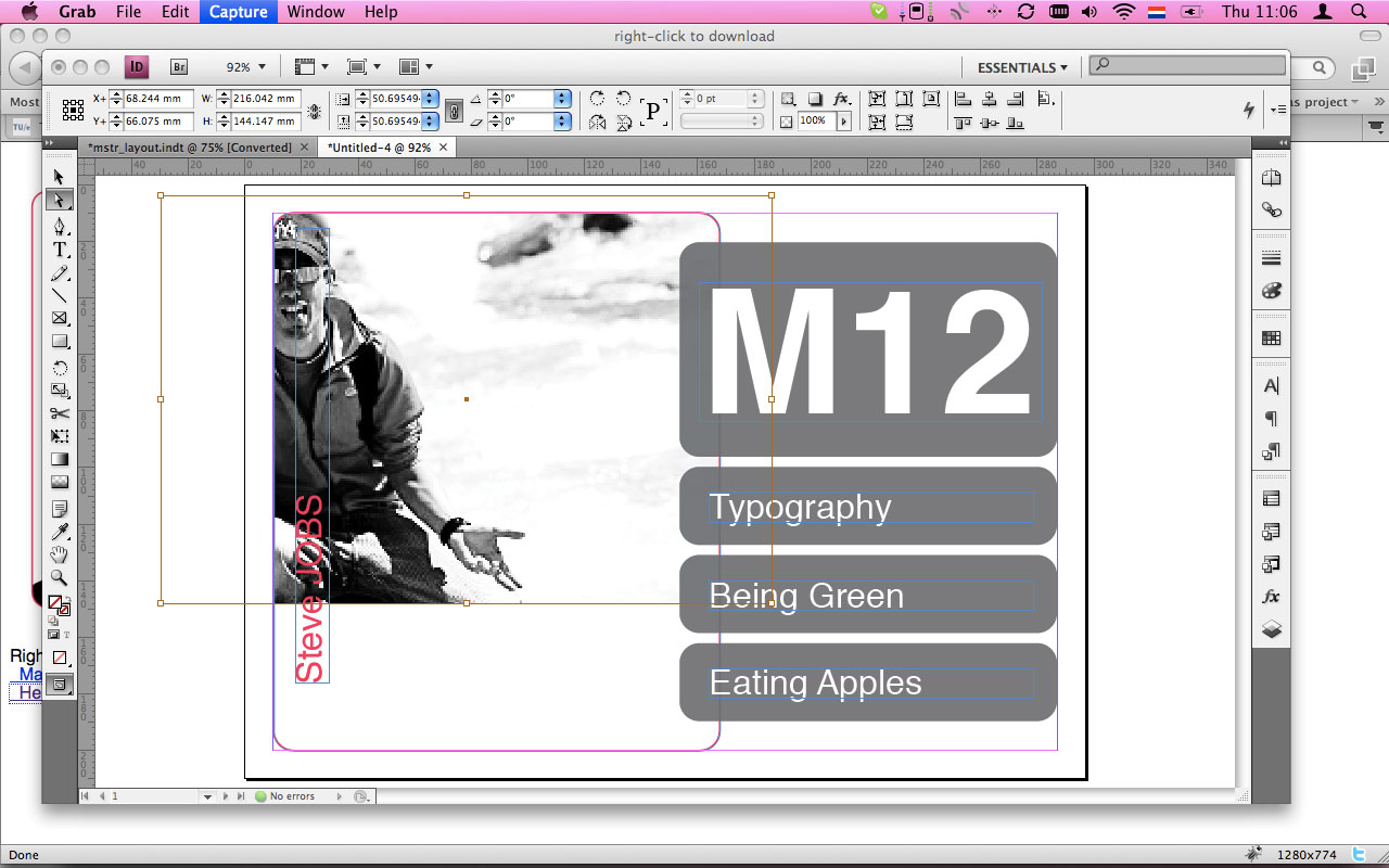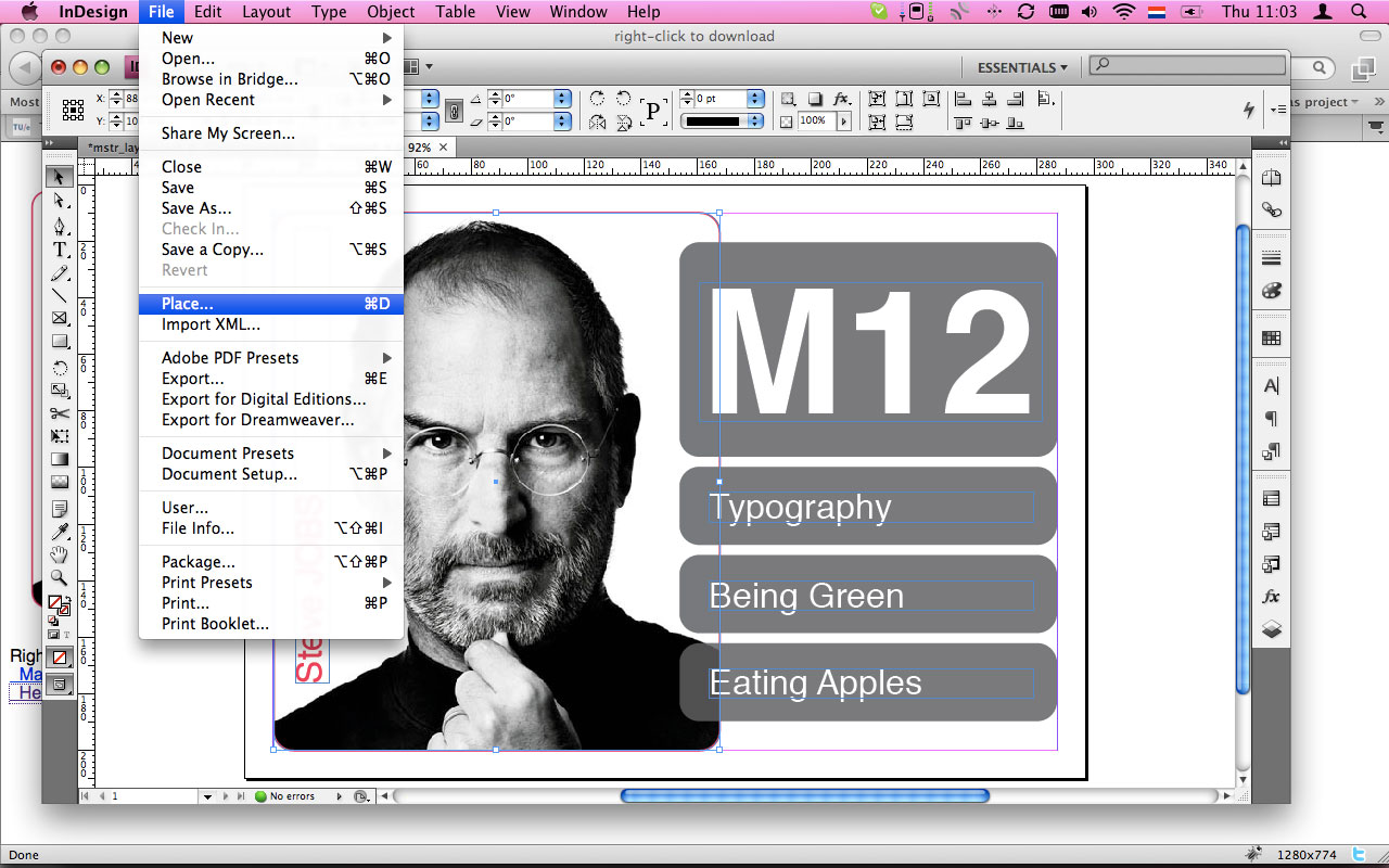 | 1. Choose your Photo, edit this with Photoshop: make this Black and White, play with the curves until you get the same effect as Steve. Keep in mind that your name will be on the Lefthand-side, so a light/white background (on that side) will give a better effect. 2. Save your photo. 3. Open the .INX in InDesign. 4. Ignore the Font Subsitution Error. 5. Select your big friend Steve and Place your photo by clicking menu "File" "Place": |
